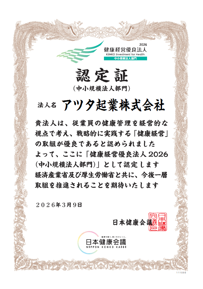 この度、当社は、経済産業省と日本健康会議が推進する「健康経営優良法人2026(中小規模法人部門)」に認定されました。2022年度より毎年認定を頂き、今年で5回目となります。